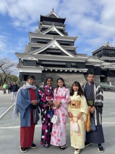 また異文化理解を深める取り組みの一環として、熊本城へ観光に出かけました。当日は着物を着用し、日本の伝統