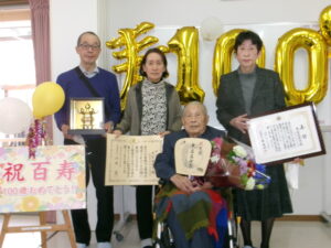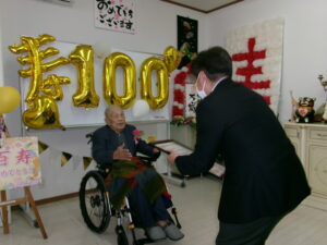 このたび、当施設ご利用者様が100歳の節目となる百寿を迎えられました。 長年にわたり歩んで来られた人生に、職員一同心より敬意とお祝いを申し上げます。